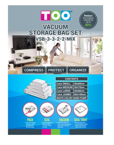 Fedezd fel a helytakarékos és rendszerezett tárolás új szintjét ezzel a vákuumzsák készlettel pumpával, amely ideális választás ágyneműk, ruhák és egyéb textíliák praktikus elhelyezésére. A különböző méretű zsákoknak köszönhetően egyetlen szettel megoldhatod a teljes háztartás tárolási problémáit – a párnahuzattól egészen a vastag paplanokig.
