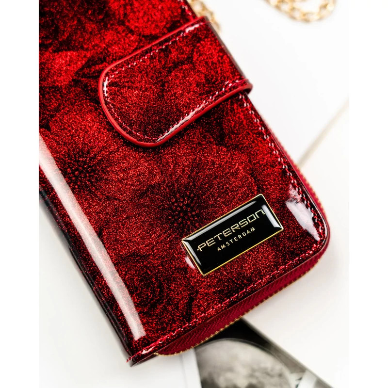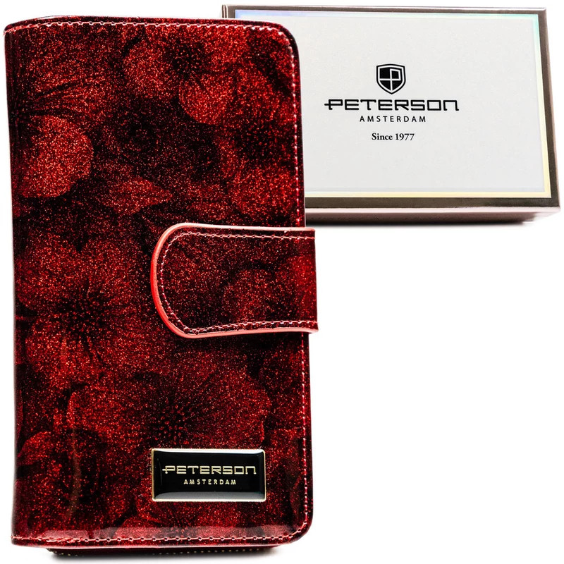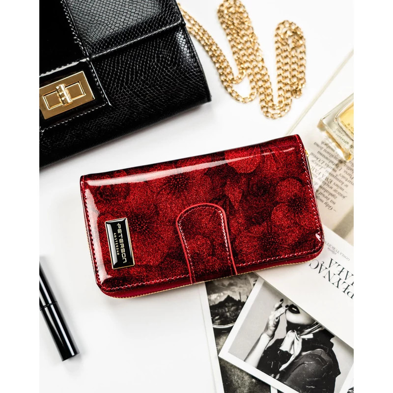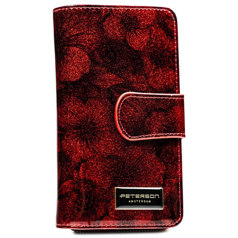 Nagy, piros női pénztárca virágokkal, lakkbőrből, patenttal és cipzárral, Peterson