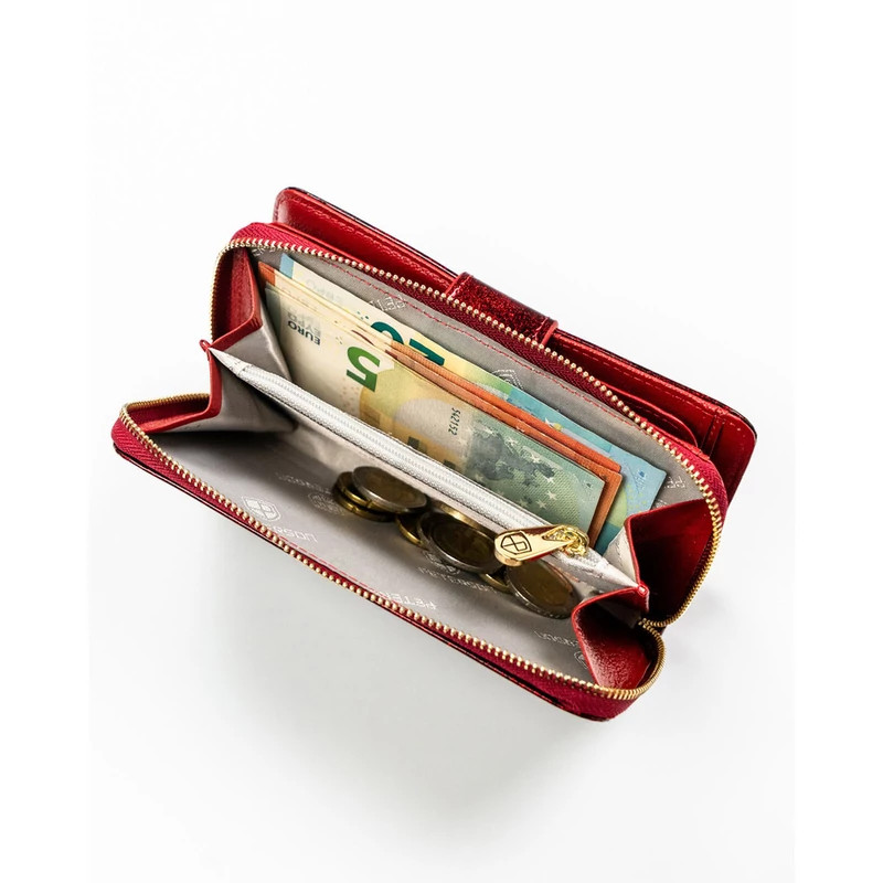 Speciális, RFID BLOKKOLÓ RENDSZERREL (rádiófrekvenciás azonosító) ellátott béléssel ellátott pénztárca, amely védi a közelségi kártyákat, biometrikus dokumentumokat, személyi igazolványokat és tömegközlekedési kártyákat a jogosulatlan adatolvasástól. A technológia lehetetlenné teszi az adatok olvasását speciális, adatlopásra használt olvasók segítségével.