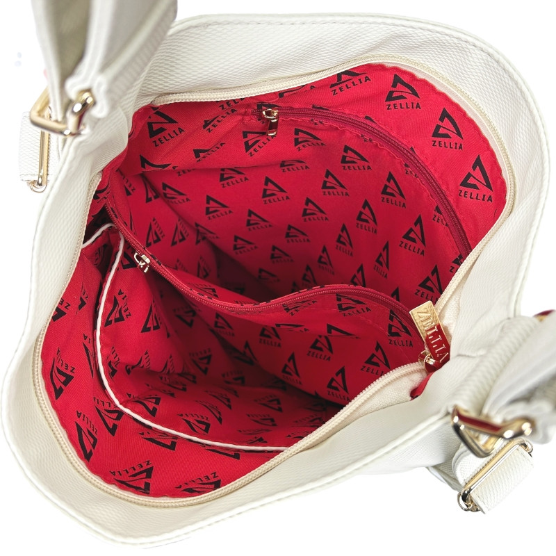 A tágas belső tér piros béléssel van ellátva, amelyet fekete Zellia logók díszítenek. Több zseb és rekesz segíti a rendszerezést, így könnyedén tárolható benne minden fontos személyes tárgy.