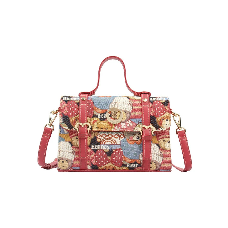 A Henney Bear CUTE BEAR válltáska/kézitáska kedves és vidám megjelenést kínál, színes gobelin mintáján különféle, téli öltözetű mackófigurákkal. A meleg árnyalatú piros műbőr részletek friss, élénk karaktert adnak a táskának, míg az aranyszínű fémkiegészítők elegáns, prémium hatást biztosítanak. Praktikus kialakítása révén kézben és vállon is kényelmesen hordható, így sokoldalú választás a mindennapokra.